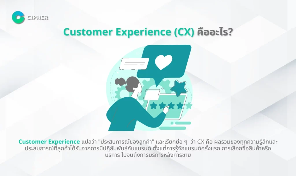 Customer Experience แปลว่า “ประสบการณ์ของลูกค้า” และเรียกย่อ ๆ ว่า CX คือ ผลรวมของทุกความรู้สึกและประสบการณ์ที่ลูกค้าได้รับจากการมีปฏิสัมพันธ์กับแบรนด์ ตั้งแต่การรู้จักแบรนด์ครั้งแรก การเลือกซื้อสินค้าหรือบริการ ไปจนถึงการบริการหลังการขาย ซึ่งไม่ได้จำกัดอยู่เพียงแค่จุดสัมผัสเดียว แต่เป็นภาพรวมของทุกการปฏิสัมพันธ์ที่ลูกค้ามีกับแบรนด์ตลอดทั้งกระบวนการ ทุกความรู้สึกและการรับรู้เหล่านี้ก่อให้เกิดความประทับใจและส่งผลต่อการตัดสินใจซื้อซ้ำในอนาคต