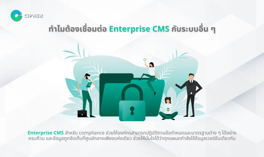การเชื่อมต่อ Enterprise CMS เชื่อมต่อระบบ ต่าง ๆ ยังช่วยสร้างประสบการณ์การใช้งานที่ราบรื่นสำหรับพนักงาน ลดเวลาในการค้นหาข้อมูล และสนับสนุนการทำงานร่วมกันระหว่างแผนกต่างๆ ได้อย่างมีประสิทธิภาพมากขึ้น อีกทั้งยังสามารถปรับใช้เป็น compliance management system ที่ช่วยให้องค์กรปฏิบัติตามข้อกำหนดทางกฎหมายและมาตรฐานอุตสาหกรรมได้อย่างครบถ้วน