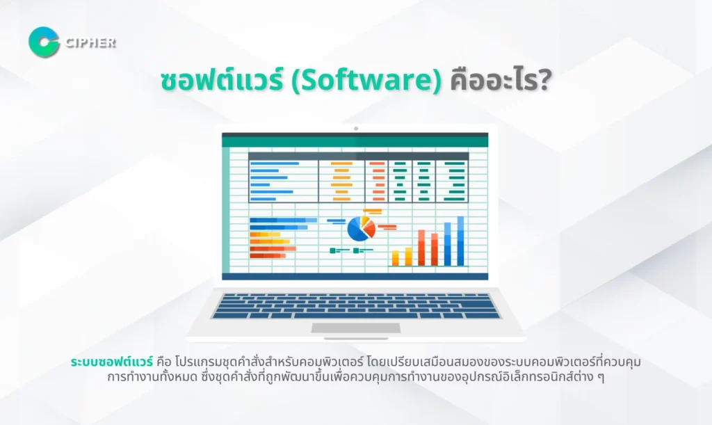 การรู้ว่าซอฟต์แวร์มีอะไรบ้าง และเข้าใจถึงความหมายของ Software คืออะไร ถือเป็นพื้นฐานสำคัญสำหรับทุกธุรกิจ เพราะโปรแกรมซอฟต์แวร์ ได้กลายเป็นเครื่องมือหลักในการขับเคลื่อนองค์กรสมัยใหม่ แล้ว Software มีอะไรบ้างที่จำเป็นต่อการทำงาน? การเข้าใจประเภทและการใช้งานของซอฟต์แวร์จะช่วยให้ธุรกิจสามารถเลือกใช้เครื่องมือได้อย่างเหมาะสม และในบทความนี้ CIPHER ที่มีประสบการณ์ในด้านบริการพัฒนาระบบซอฟต์แวร์ จะช่วยไขข้อสงสัยและแนะนำซอฟต์แวร์สำคัญที่ควรรู้จักสำหรับการพัฒนาธุรกิจของคุณ
