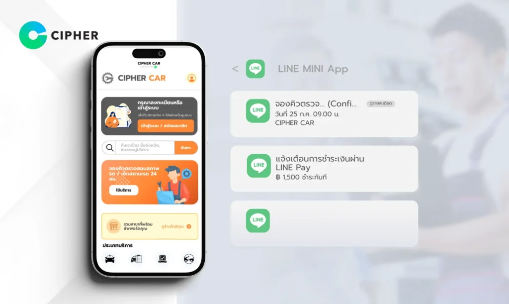 LINE MINI App สำหรับศูนย์บริการรถยนต์ เป็นโซลูชันที่ตอบโจทย์ทั้งเจ้าของธุรกิจและลูกค้า พร้อมทั้งสร้างภาพลักษณ์ที่ทันสมัยให้กับศูนย์บริการของคุณ ถ้าคุณกำลังมองหาวิธีพัฒนาธุรกิจศูนย์บริการรถยนต์ให้ก้าวหน้าขึ้น CIPHER พร้อมเป็นพาร์ทเนอร์ในการสร้าง LINE MINI Appที่เหมาะกับธุรกิจของคุณมากที่สุด