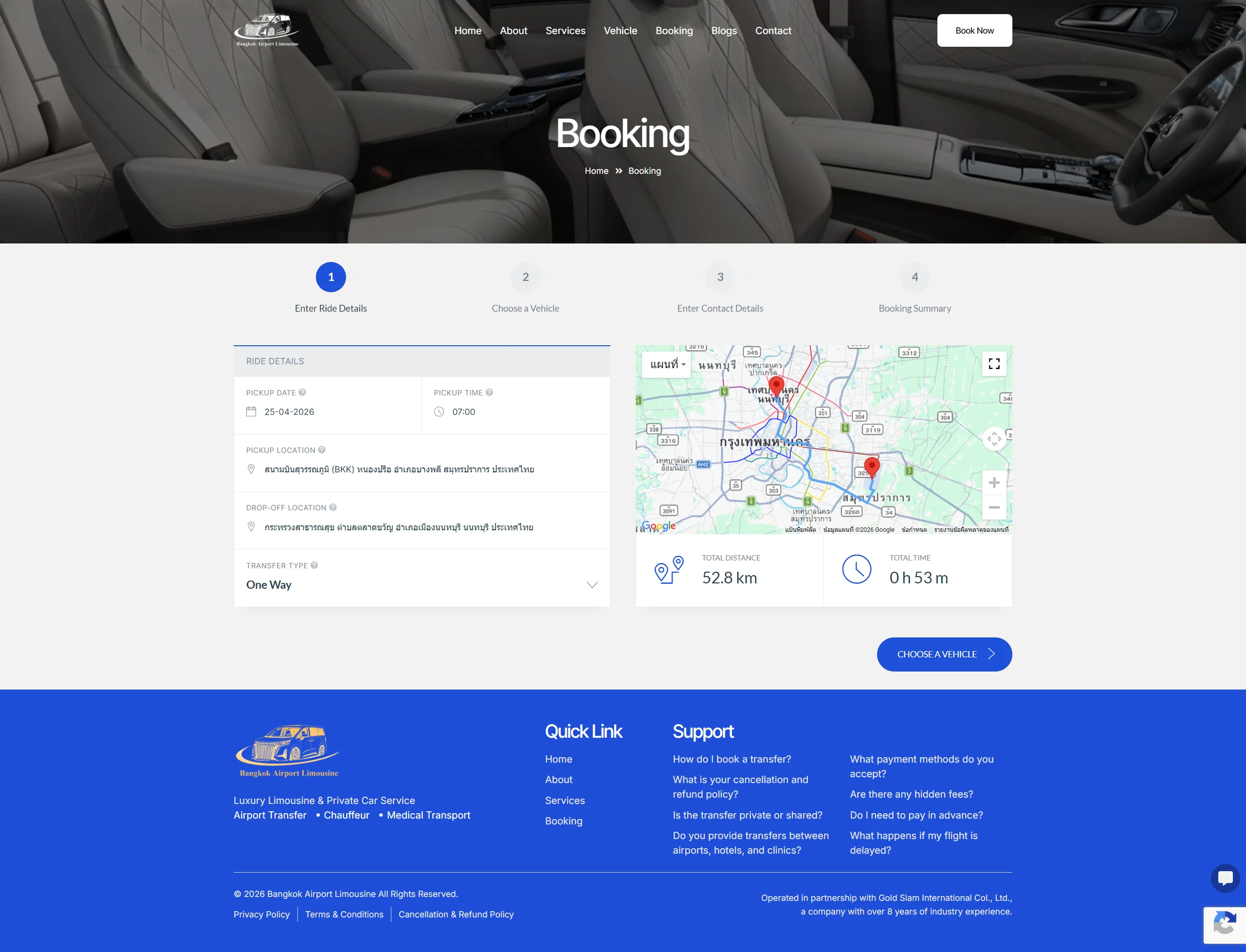 รองรับระบบการจองรถรับส่งได้อัตโนมัติ มีระบบเช็คคิวว่างของรถในวันที่ต่างๆ, การคำนวณค่าบริการตามระยะทางจริงโดยอ้างอิงข้อมูลจาก google api และรองรับการชำระเงินที่หลากหลายตามความต้องการของบริษัท