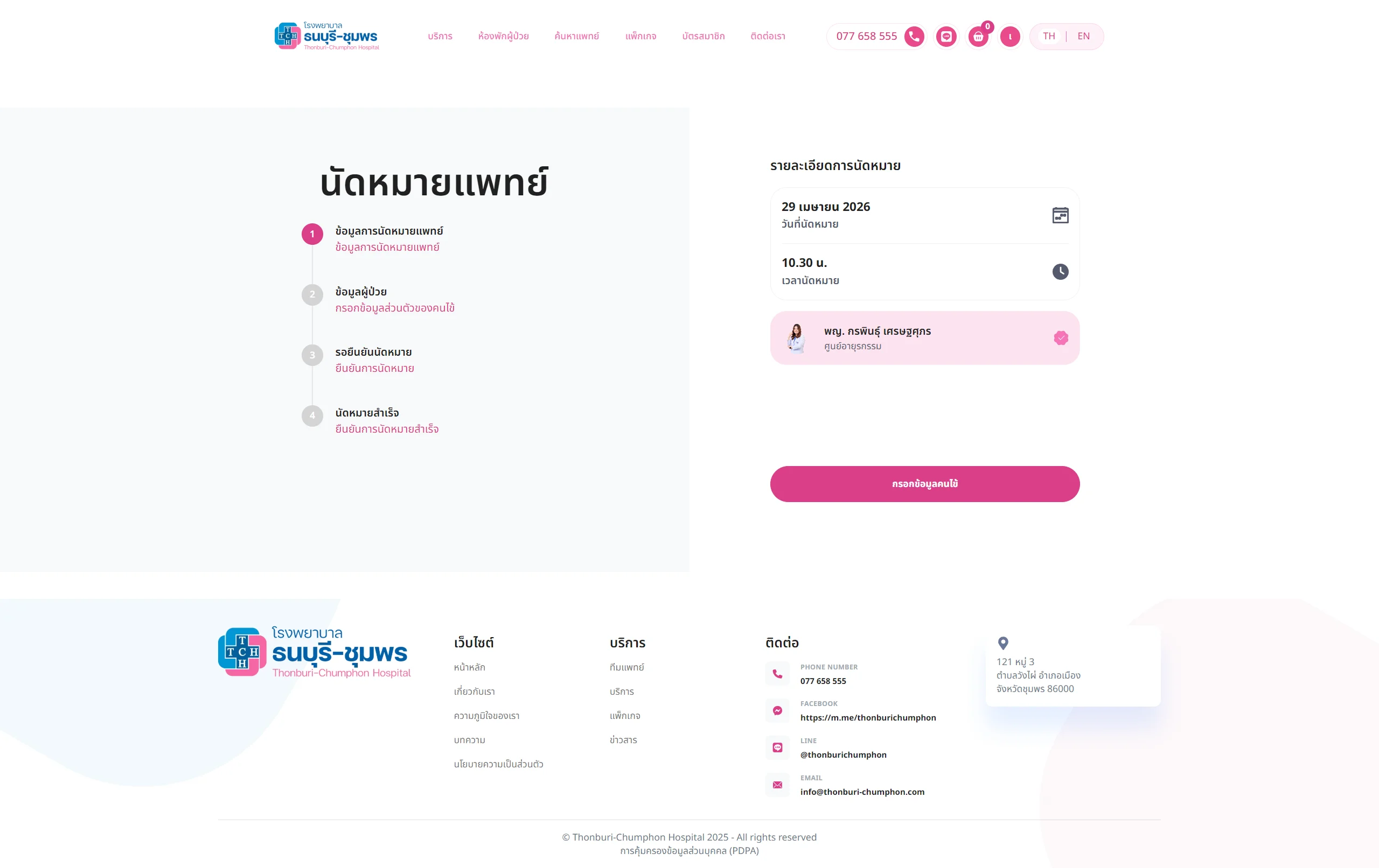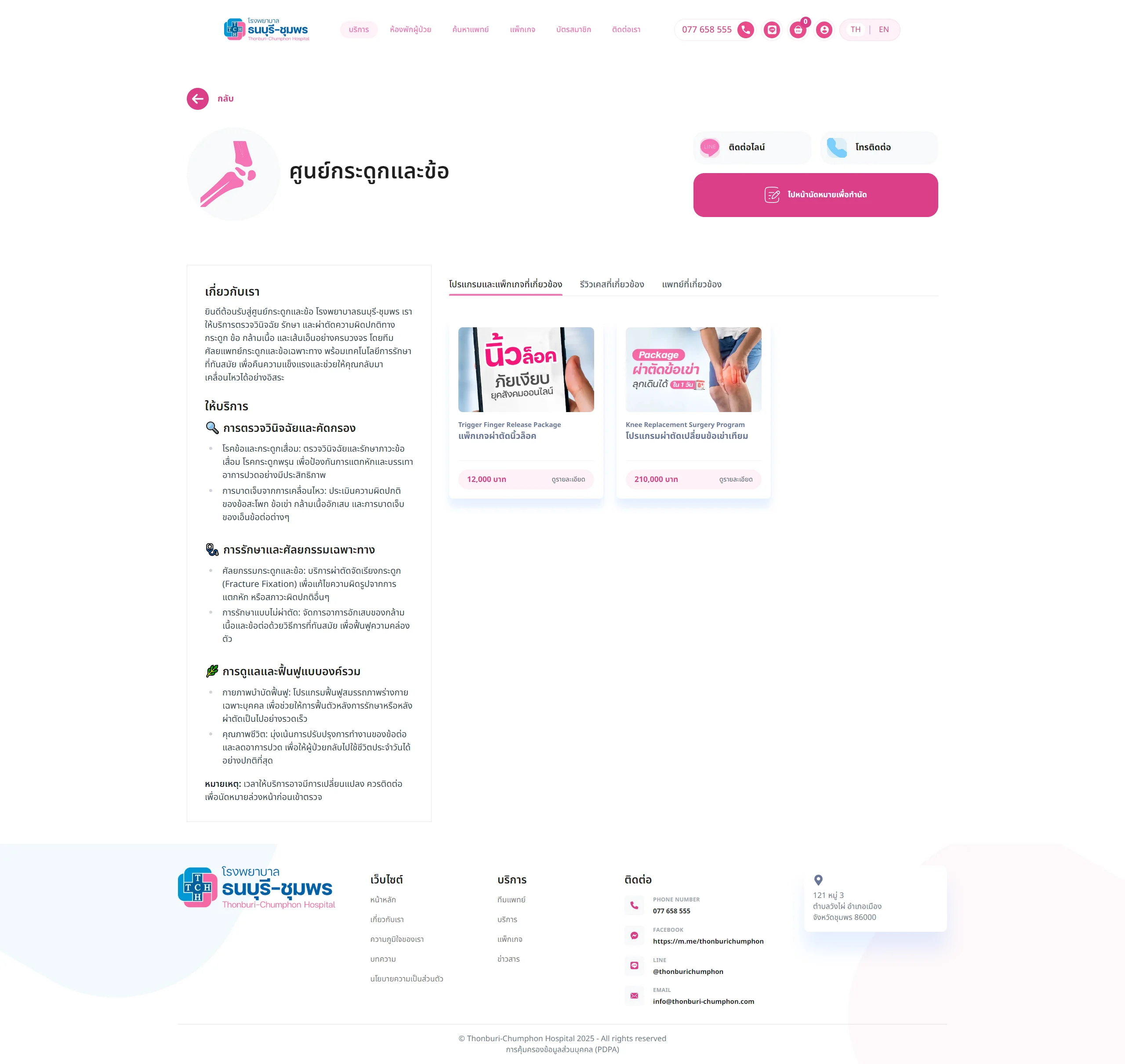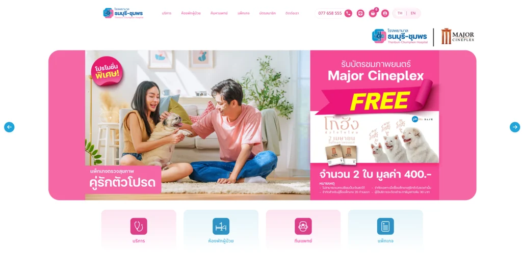 เว็บไซต์ thonburi-chumphon.com เป็นเว็บไซต์ทางการของโรงพยาบาลธนบุรี-ชุมพร มีเป้าหมายหลักคือ ให้ข้อมูลบริการทางการแพทย์, ขายแพ็กเกจสุขภาพ, นัดหมายการใช้บริการ, สร้างความน่าเชื่อถือแบรนด์, ให้ความรู้สุขภาพผ่านบทความและเป็นช่องทางการติดต่อสื่อสารระหว่างโรงพยาบาลและผู้ที่สนใจใช้บริการอีกช่องทางหนึ่ง