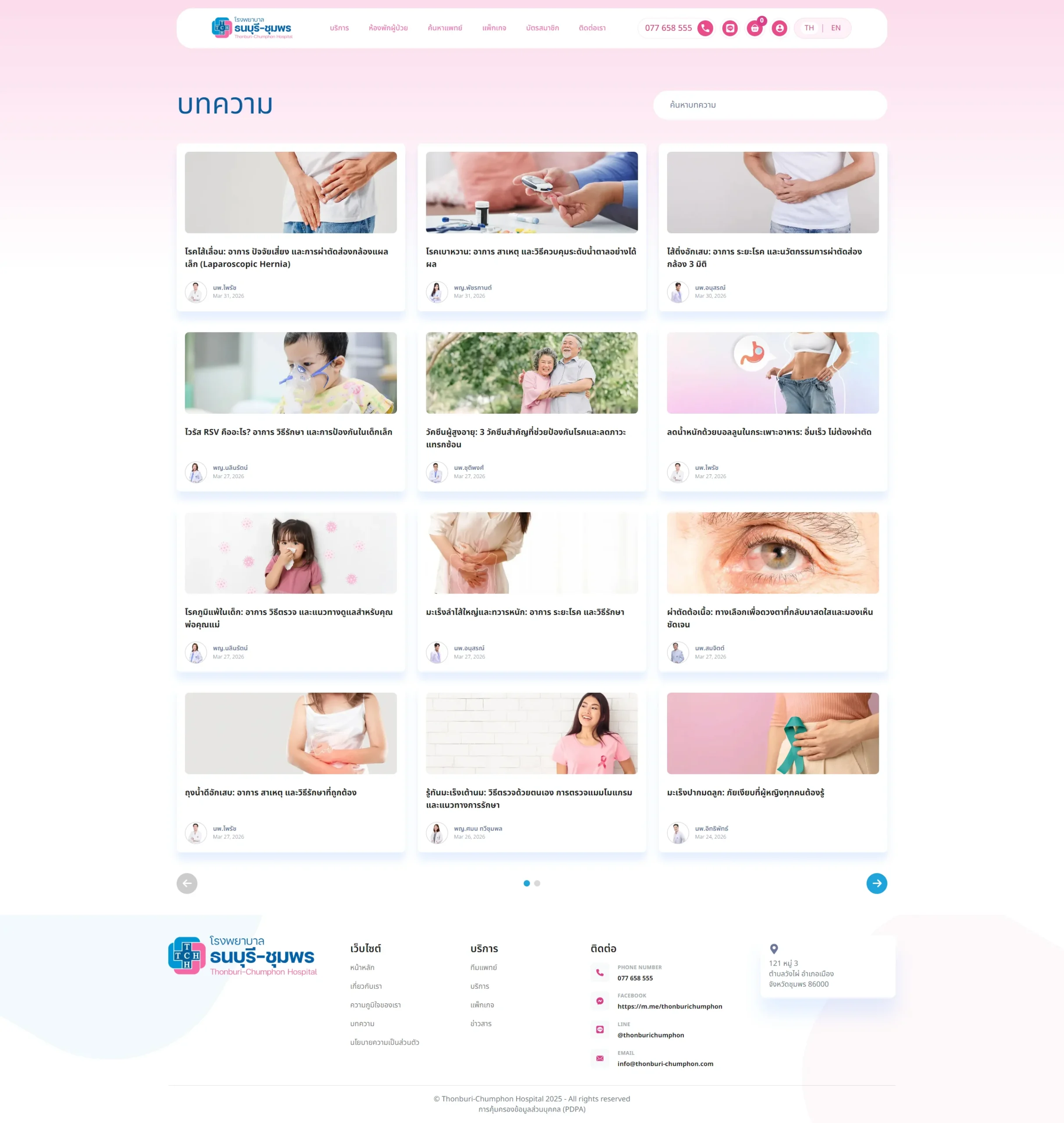 ด้านการประชาสัมพันธ์ เว็บไซต์รองรับระบบจัดการบทความเพื่อเพิ่มเนื้อหาและให้ความรู้เกี่ยวกับการแพทย์แก่ผู้ที่สนใจ อีกทั้งยังมีส่วนของหน้าข่าวสารสำหรับอัปเดตความเคลื่อนไหวขององค์กร เป็นช่องทางประชาสัมพันธ์ และการสร้างภาพลักษณ์ที่ดีให้กับองค์กรได้อีกด้วย โดยในหน้าบทความต่างๆ นอกจากจะเป็นการให้ความรู้แก่ประชาชนทั่วไปแล้วยังสามารถนำเสนอแพ็คเกจสุขภาพที่เหมาะสมหรือเกี่ยวข้องกับบทความนั้นๆ ได้อีกด้วย เป็นการส่งเสริมการขายได้อย่างเหมาะสม
