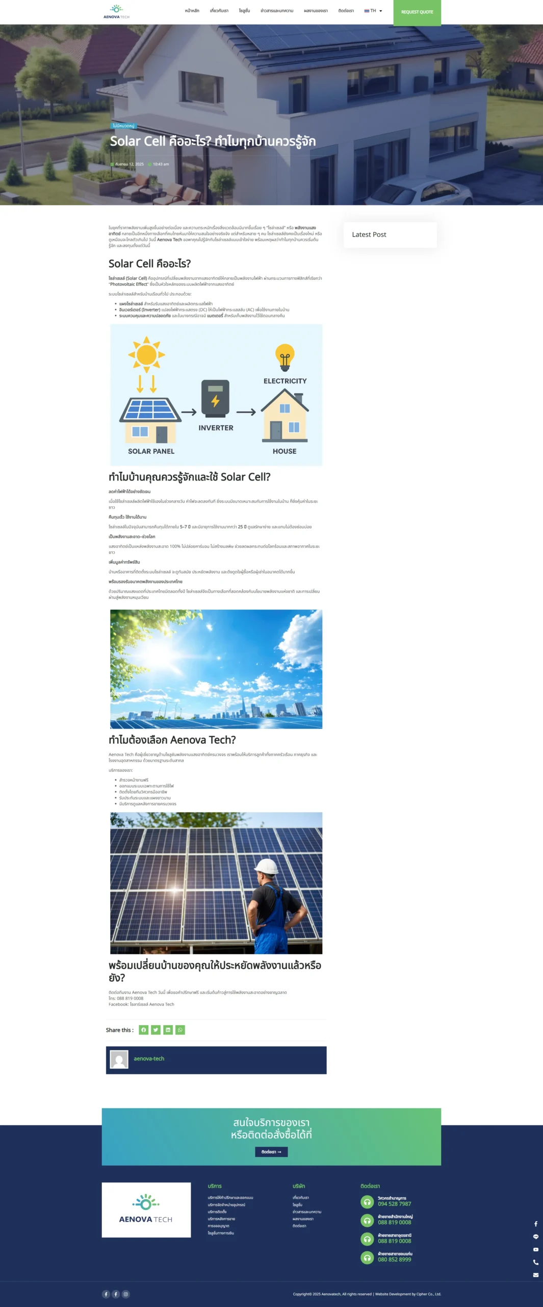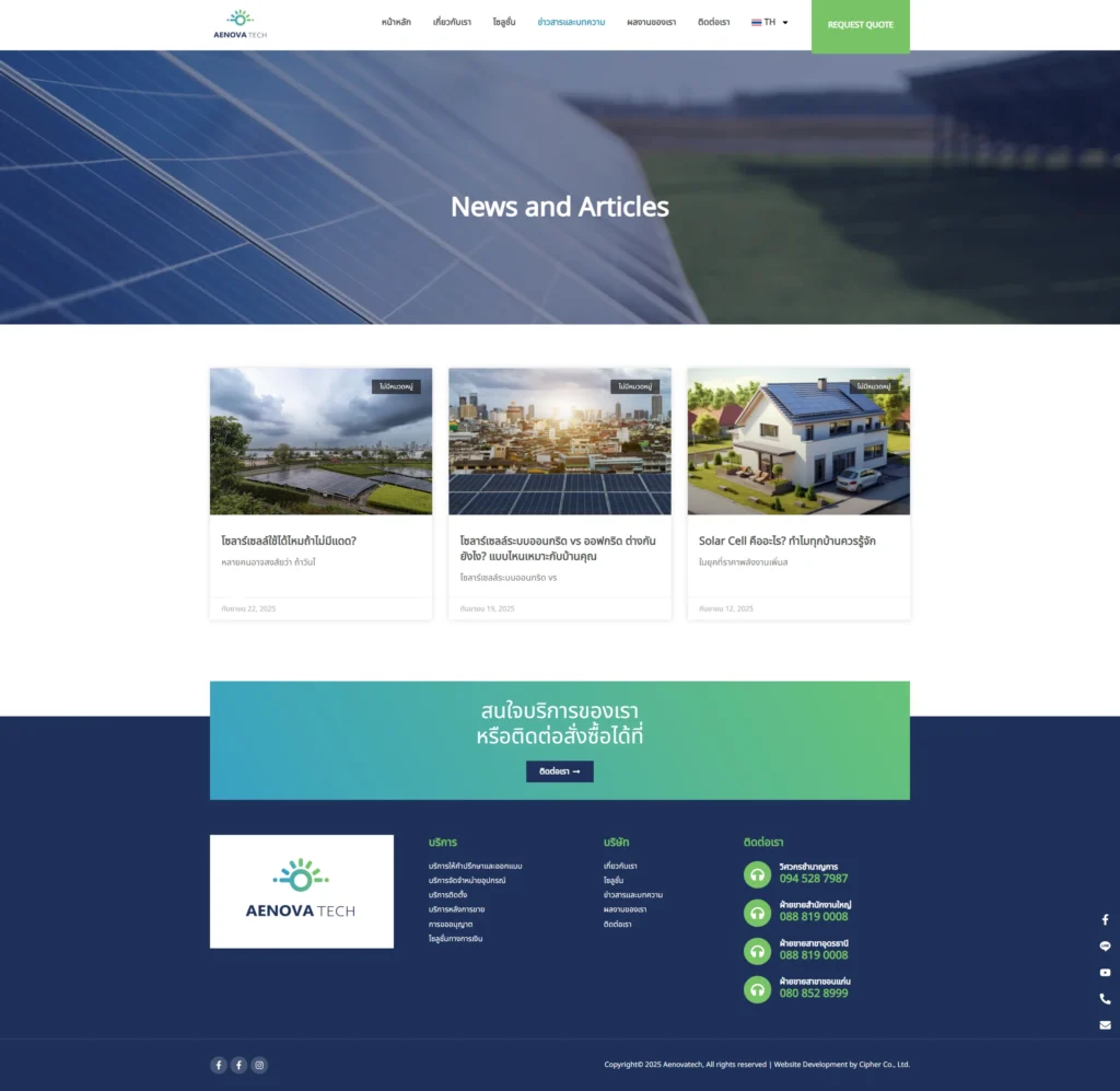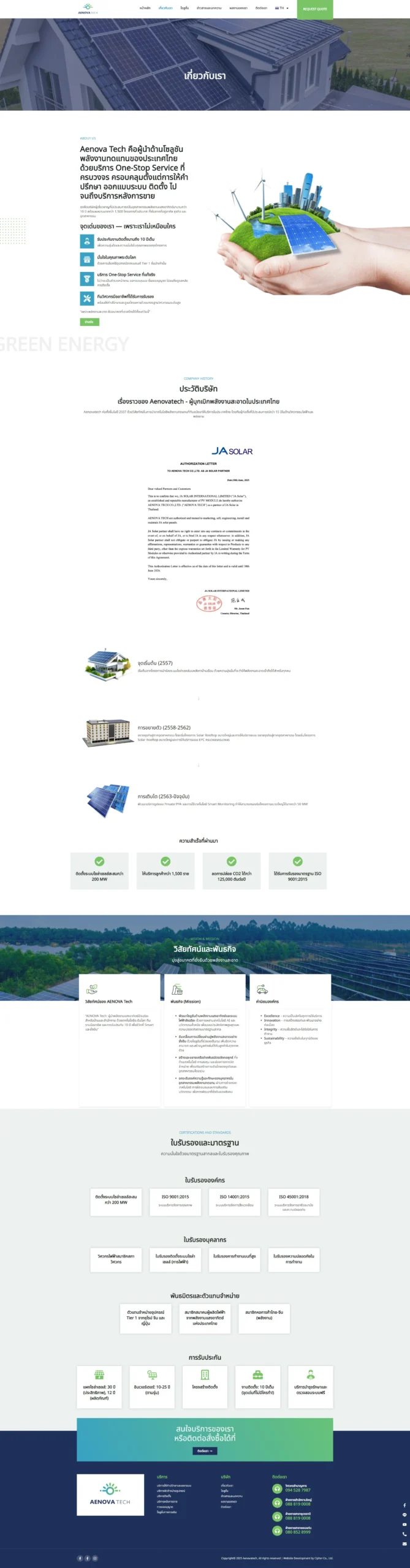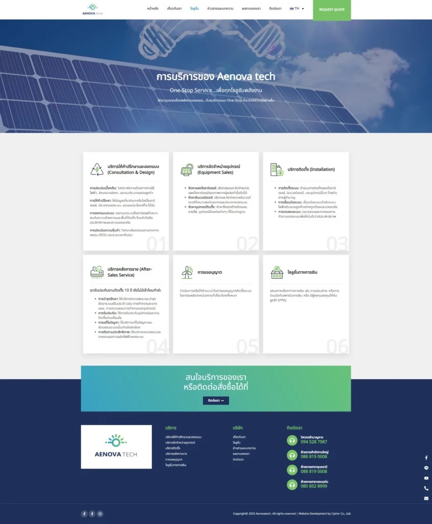 Aenova Tech เป็นบริษัทที่ให้บริการโซลูชันพลังงานแสงอาทิตย์ (solar energy solutions) แบบครบวงจร (“One-Stop Service”) ตั้งแต่ปรึกษา ออกแบบ ติดตั้ง ดำเนินงานและบริการหลังการขาย ฯลฯ เว็บไซต์เน้นนำเสนอจุดแข็ง เช่น ประสบการณ์กว่า 10 ปี, โครงการกว่า 1,500 แห่งทั่วประเทศ, ทีมวิศวกรมืออาชีพ, การันตีงานติดตั้ง 10 ปี ฯลฯ