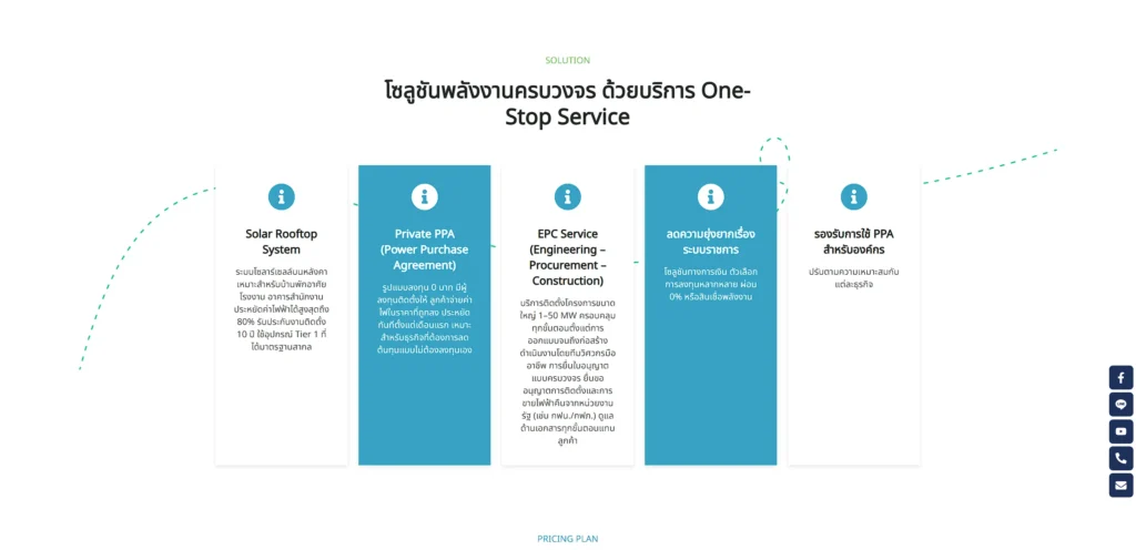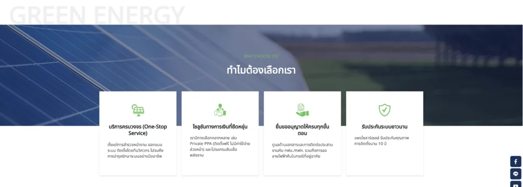 เว็บไซต์จะใช้สีขาวเป็นพื้นหลังทำให้ดูสะอาด อ่านง่าย และทำให้ภาพกราฟิกในแต่ละส่วนเด่นขึ้นมาได้ดี ใช้สีเขียว (“Green Energy” / สีธีมพลังงานสะอาด) เพื่อแสดงถึงจุดที่เกี่ยวกับพลังงานสะอาด / sustainability / solutions ฯลฯ ซึ่งเหมาะกับธุรกิจพลังงานแสงอาทิตย์ เพราะสีเขียวให้ความรู้สึก “ธรรมชาติ / พลังงานสะอาด” นอกจากนี้ใช้สีเข้ม / สีดำ / สีเทาเข้ม ใช้กับข้อความหลัก /เมนู /หัวข้อ เพื่อให้ Contrast ชัดเจนกับพื้นหลังขาว