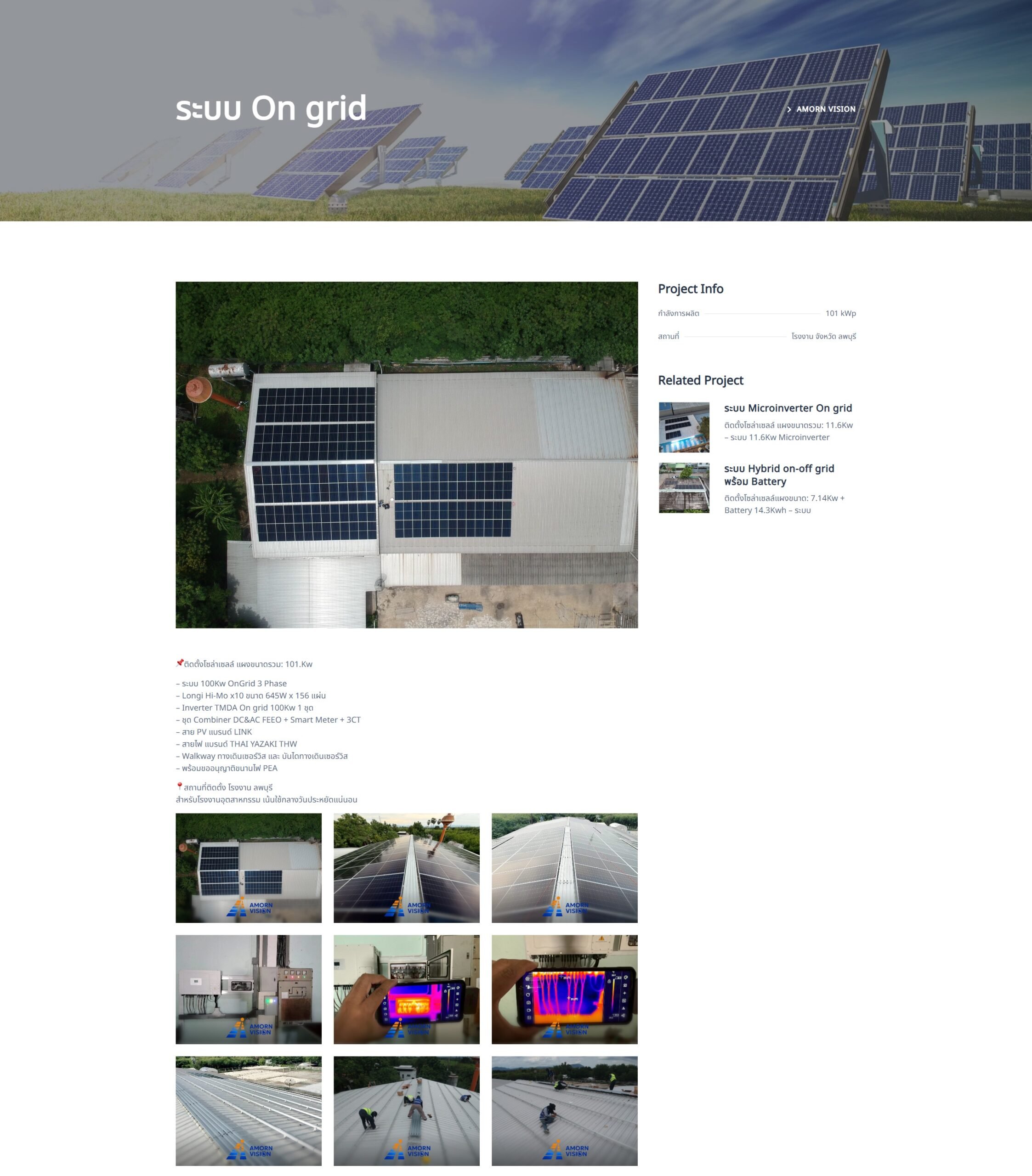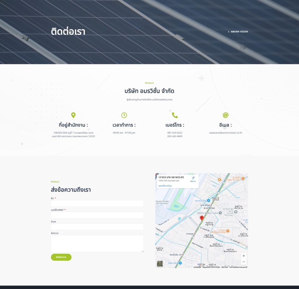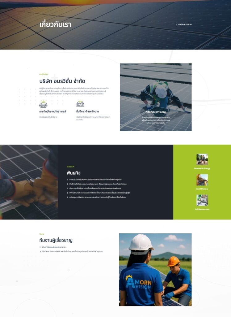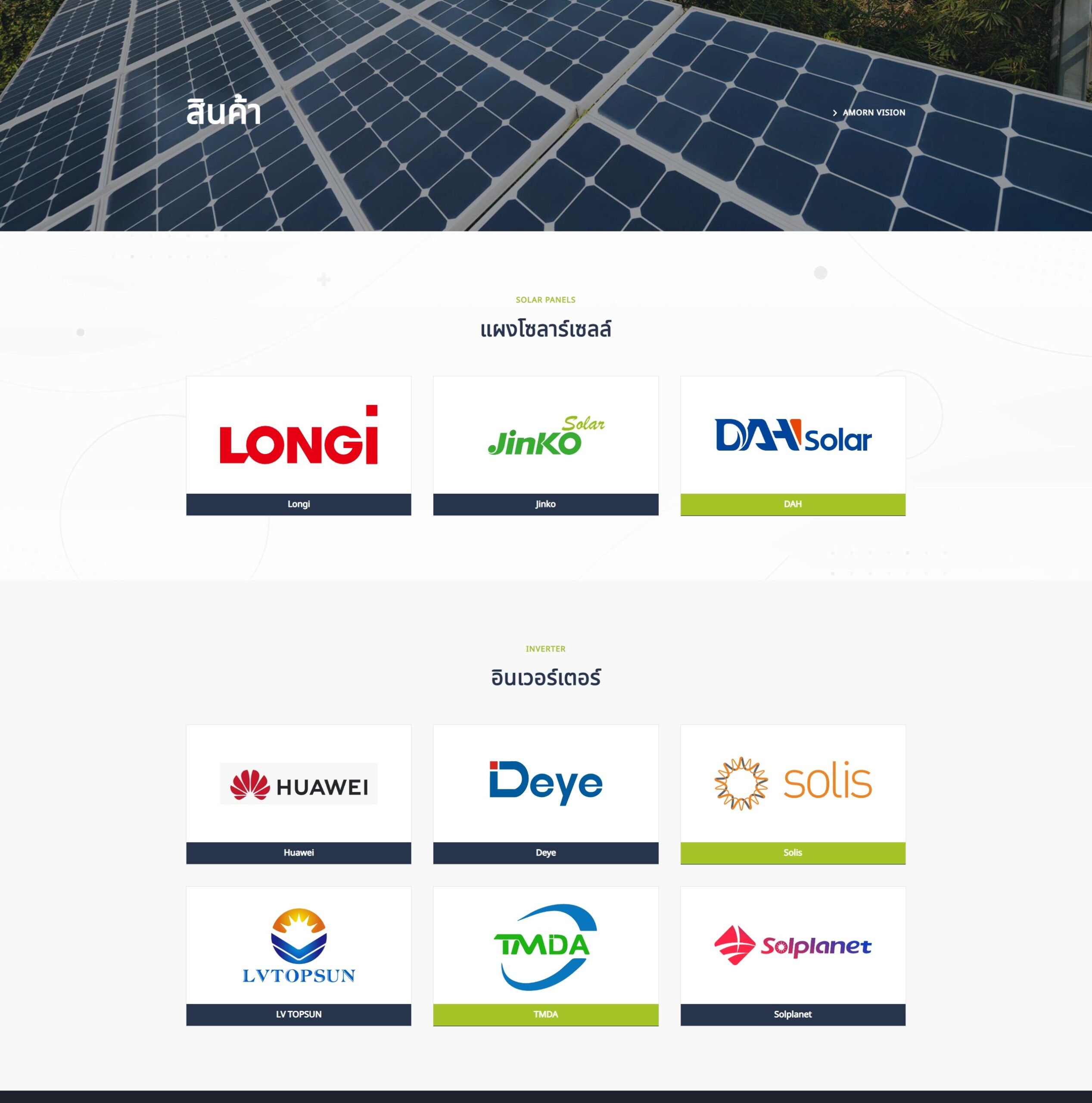 amornvision.co.th เป็นเว็บไซต์อย่างเป็นทางการของอมรวิชั่น (Amorn Vision) ผู้ให้บริการและผู้เชี่ยวชาญด้านการติดตั้งระบบโซล่าเซลล์ครบวงจร การออกแบบจึงต้องแสดงถึงความเป็นมืออาชีพของบริษัท เน้นนำเสนอข้อมูลและบริการที่หลากหลาย มีเมนูหลักอยู่ด้านบนของหน้าช่วยให้สามารถเข้าถึงเนื้อหาต่างๆ ได้อย่างสะดวก มองเห็นได้ชัดเจน เช่น หน้าแรก, เกี่ยวกับเรา, สินค้า, ระบบกักเก็บพลังงาน, โปรโมชั่น, ผลงานของเรา, ติดต่อเรา