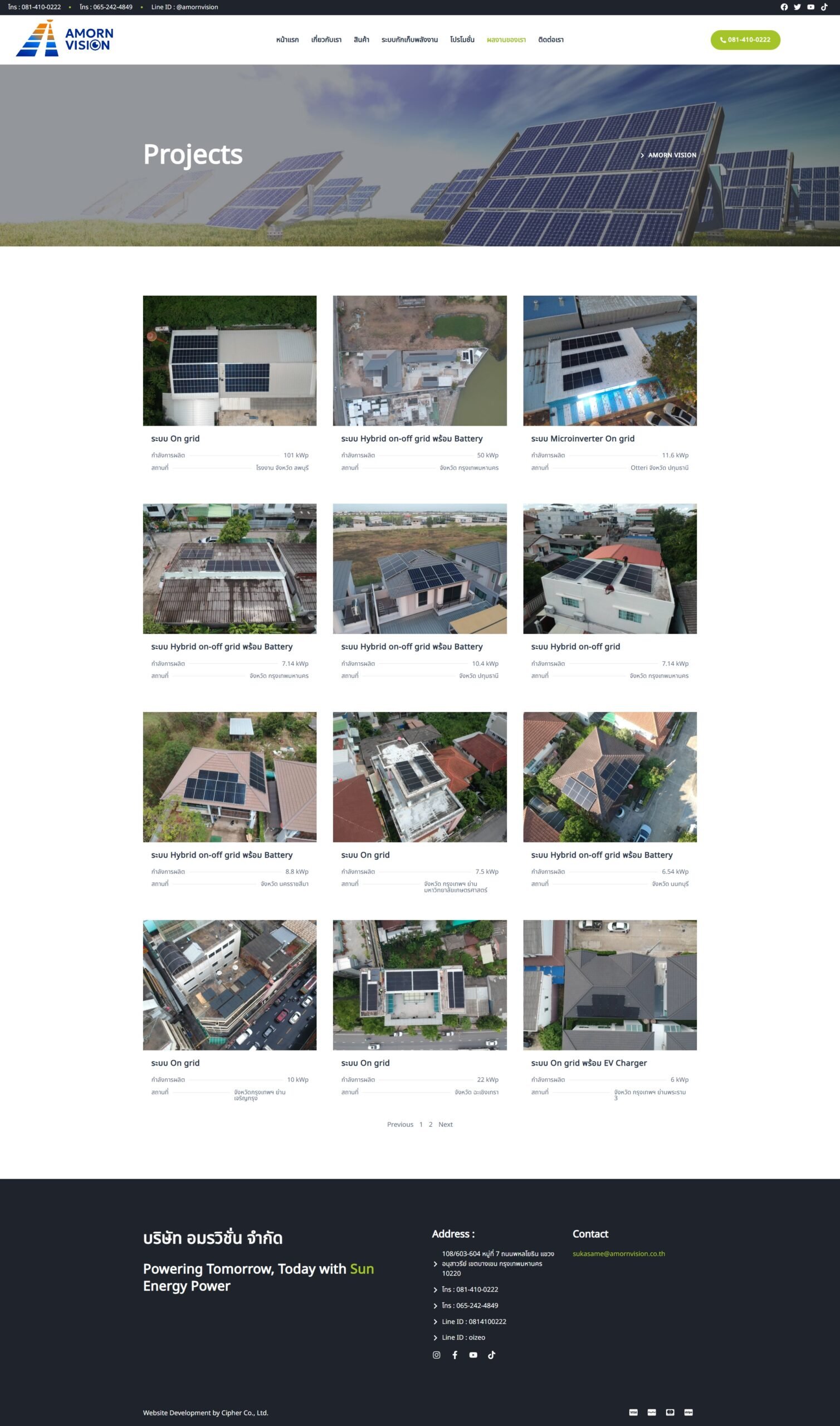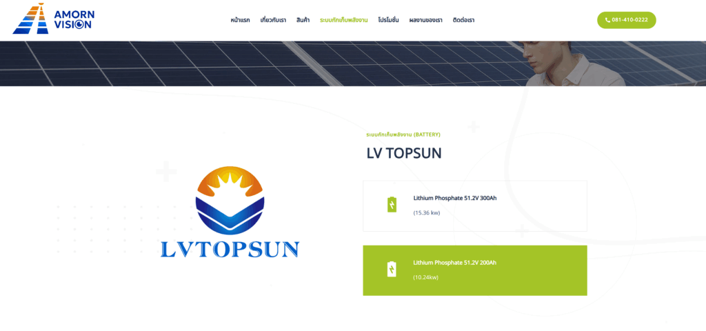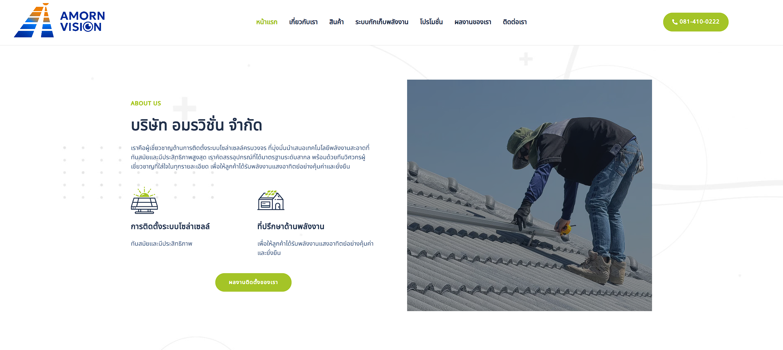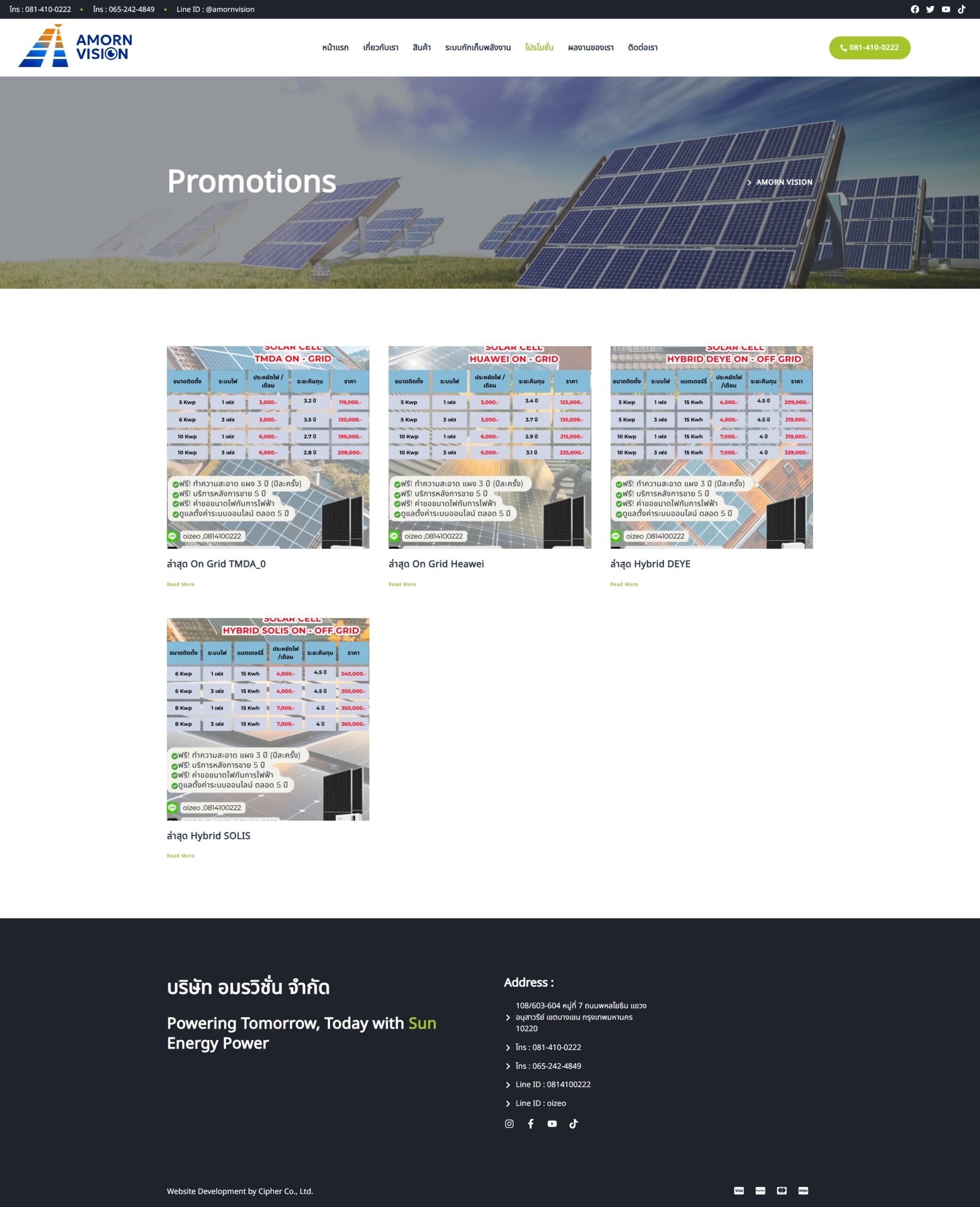 amornvision.co.th เป็นเว็บไซต์อย่างเป็นทางการของอมรวิชั่น (Amorn Vision) ผู้ให้บริการและผู้เชี่ยวชาญด้านการติดตั้งระบบโซล่าเซลล์ครบวงจร การออกแบบจึงต้องแสดงถึงความเป็นมืออาชีพของบริษัท เน้นนำเสนอข้อมูลและบริการที่หลากหลาย มีเมนูหลักอยู่ด้านบนของหน้าช่วยให้สามารถเข้าถึงเนื้อหาต่างๆ ได้อย่างสะดวก มองเห็นได้ชัดเจน เช่น หน้าแรก, เกี่ยวกับเรา, สินค้า, ระบบกักเก็บพลังงาน, โปรโมชั่น, ผลงานของเรา, ติดต่อเรา